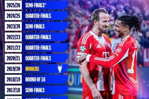 体育资讯4月28日讯 欧冠官方晒海报,列出拜仁慕尼黑近年的欧冠淘汰赛战绩,具体如下: