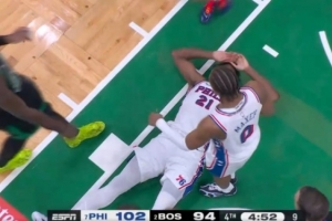 GIF-恩比德篮下强攻被奎塔犯规打倒在地
