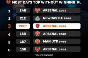 据LiveScore统计的数据,赛季领跑英超天数最多却未能最终夺冠,阿森纳此前已经有过3次这样的经历,他们曾在2022/23赛季领跑248天最终却没能拿到英超冠军。