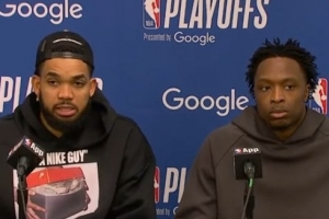 阿努诺比:这让防守变得容易多了。因为这给了我更多的时间向篮筐轮转补位,并且让我能够判断持球人是否合球了、或者他正全速冲向篮筐——因为哈特在给他施加压力。所以,这让我更容易判断该怎么做。就像你说的,他在防守端做得太棒了,充满对抗,给球施压,迫使对手加速,他就是这么打的。
