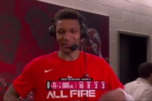 体育资讯4月27日讯 在今天结束的一场季后赛中,火箭以115-96战胜湖人。赛后,火箭球员小贾巴里·史密斯接受了媒体的采访。以下是完整版采访内容。